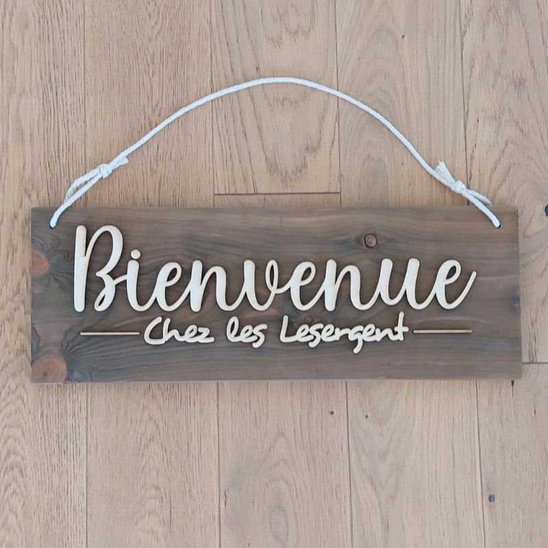 La mention « Bienvenue chez… » est réalisée en lettres découpées en relief dans du contreplaqué, puis fixées sur le panneau. Ce jeu de volumes apporte du caractère et une touche moderne tout en conservant le charme du bois.