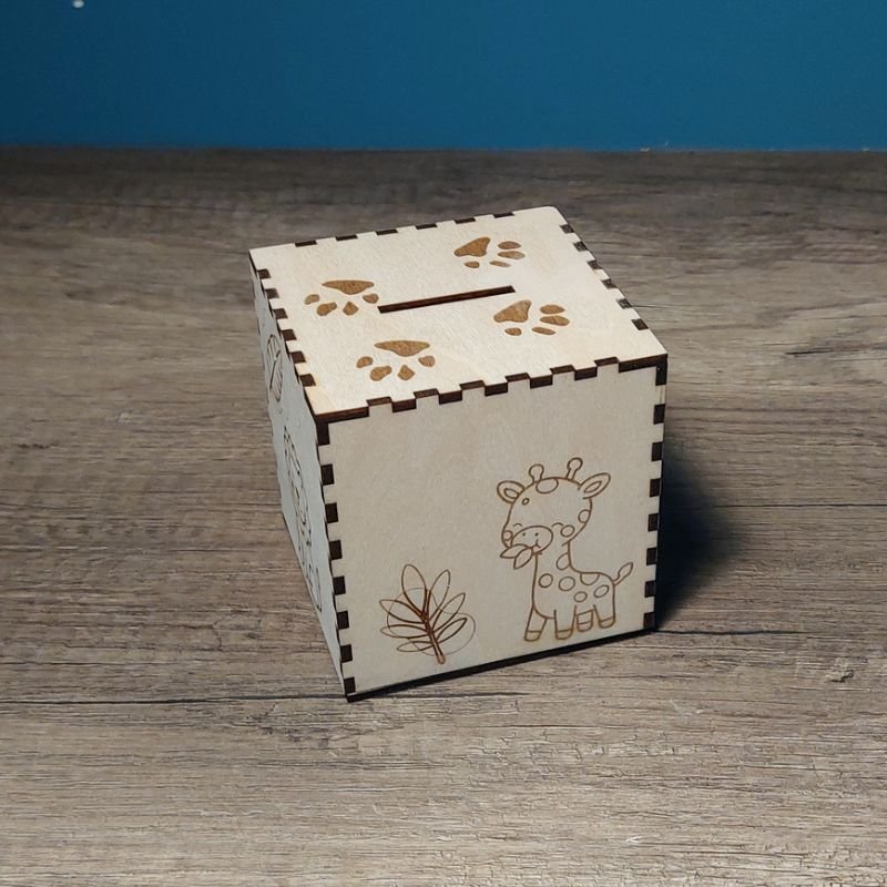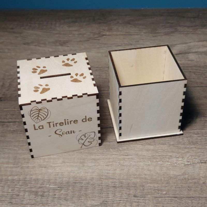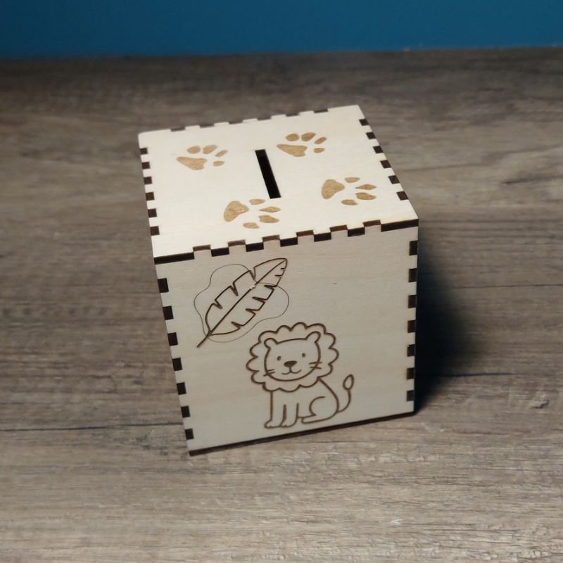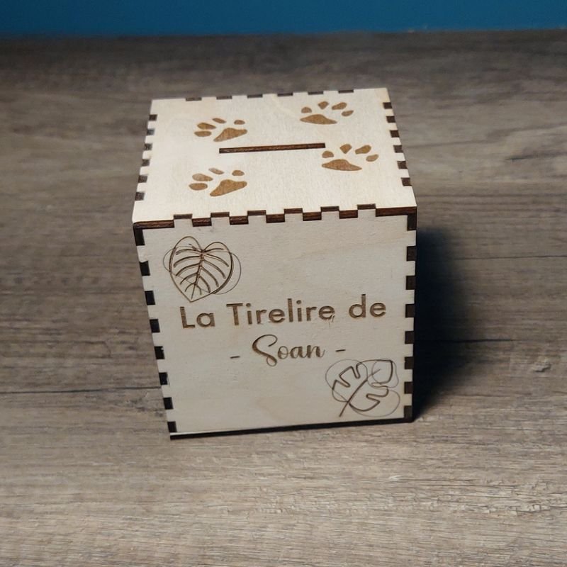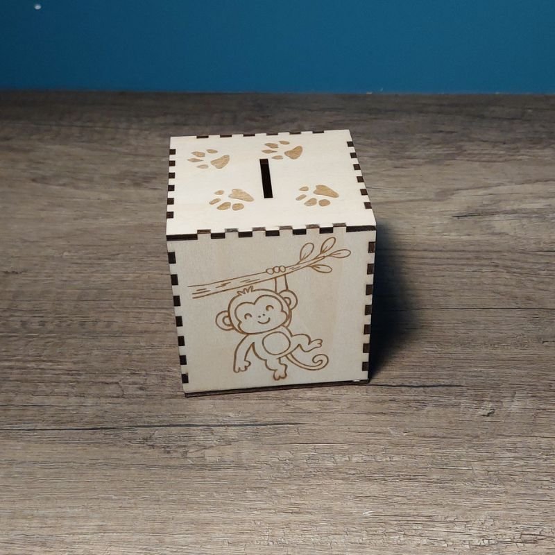 Tirelire en bois personnalisée sur le thème de la jungle, parfaite pour décorer une chambre d’enfant aux airs d’aventure.