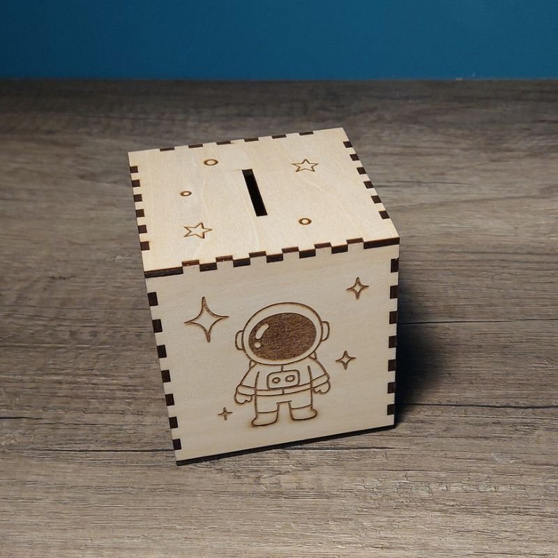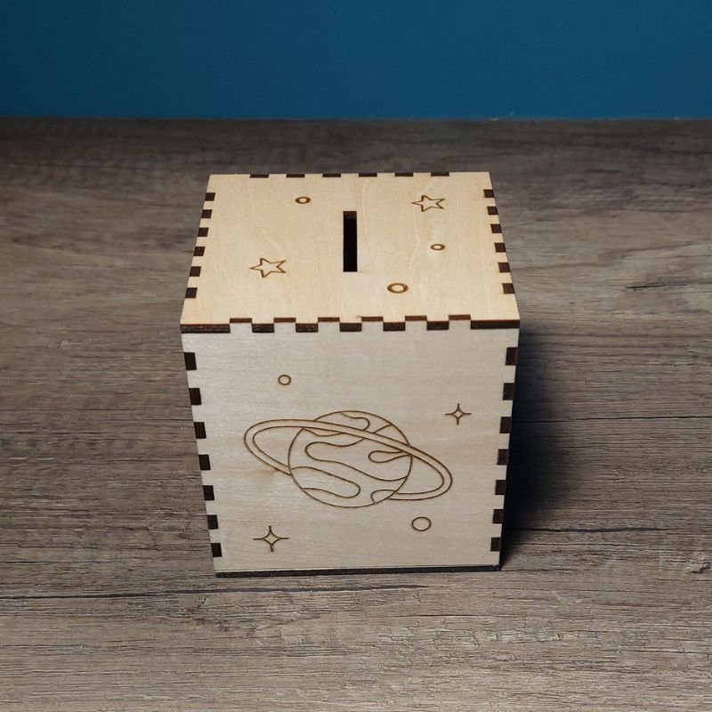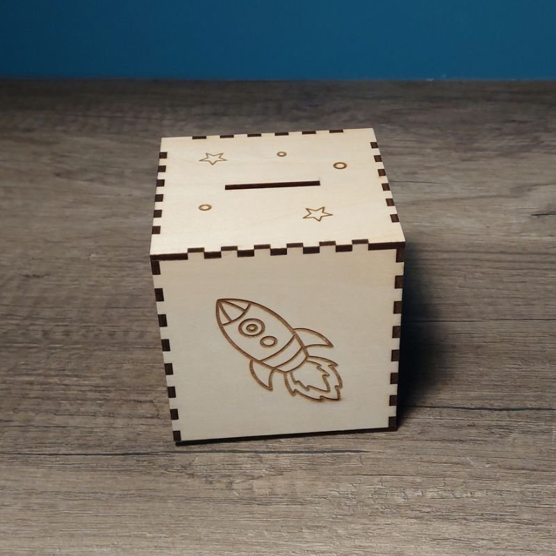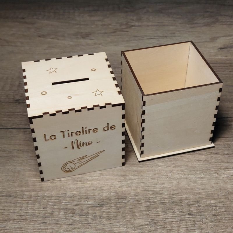 Tirelire en bois personnalisée sur le thème de l’exploration spatiale, idéale pour décorer une chambre d’enfant passionné par l’univers et les étoiles.
