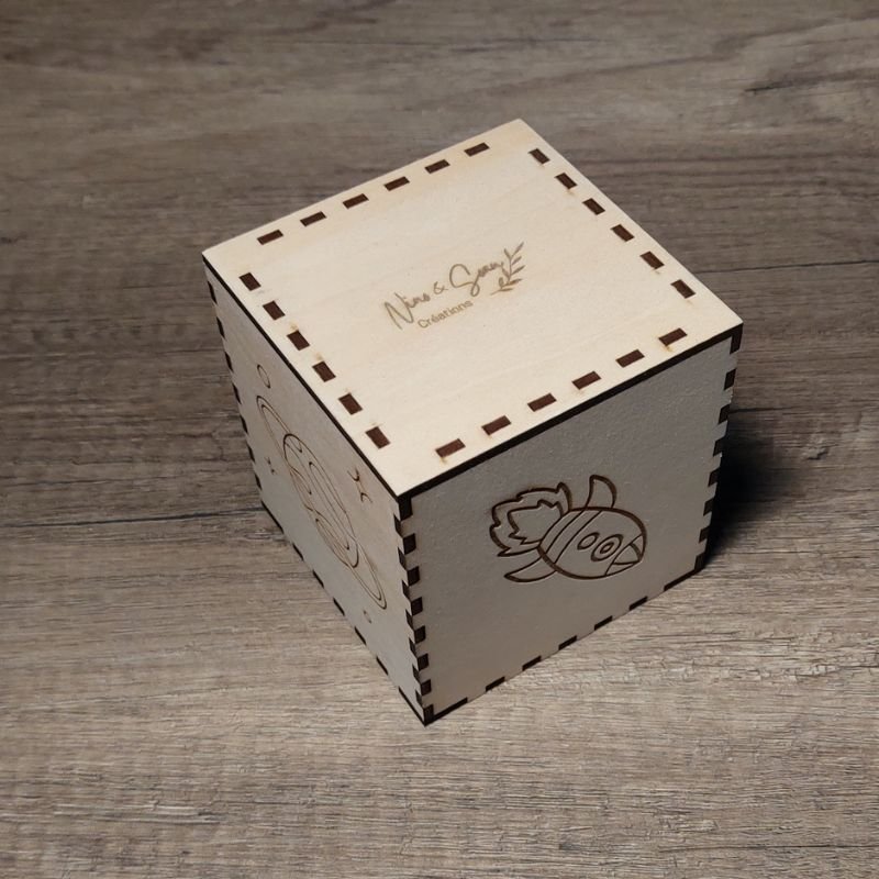 Chaque face représente un élément emblématique de l’espace : un astronaute, une planète, une fusée et le prénom de l’enfant accompagné d’une météorite. Sur le dessus, la fente est entourée d’étoiles pour prolonger l’ambiance galaxie.